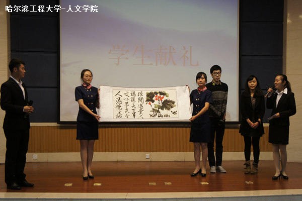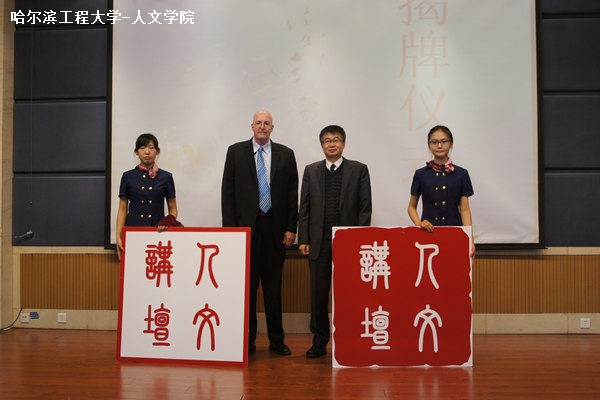 视频结束后,人文讲坛宣传部部长钱若烨、曹泽翰同学为人文讲坛送上了一幅题有“人凭德才论,文以平仄分,讲尽天下事,坛开遇贵人。”字迹的国画。紧接着夏桂华与Jeffrey W. Lucas教授共同为人文讲坛新徽标揭牌,见证人文讲坛踏上新征程。夏桂华教授还在讲话中表达了对“人文讲坛”背后那些勤勉工作的师生的感谢与鼓励,并送上对人文讲坛未来发展的祝福。