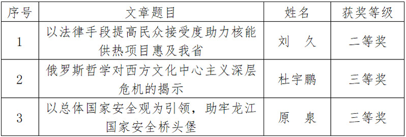 为深入贯彻落实习近平总书记重要讲话和重要指示批示精神,围绕省第十三次党代会提出的重大理论和实践问题,引领和激励全省社会科学工作者为推动龙江振兴发展提供智力支持,省社科联以“解放思想、振兴发展”为主题组织开展了论文征集和评审工作。共评选出获奖文章154篇,其中一等奖31篇,二等奖41篇,三等奖82篇。我院教师获奖共3项,其中二等奖1项、三等奖2项。
