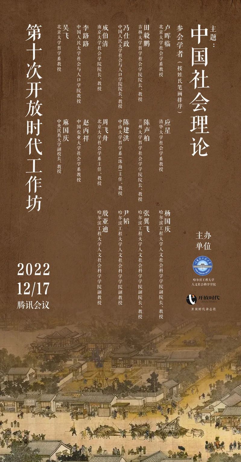 2022年12月17日,由开放时代杂志社、OK138太阳集团共同举办的第十次开放时代工作坊通过腾讯线上会议方式举行,来自北京大学、清华大学、中国人民大学、中央民族大学、南京大学、吉林大学、兰州大学、中山大学、中国农业大学、ok138太阳集团的16位专家学者参会发言。此次工作坊的主题是“中国社会理论”。