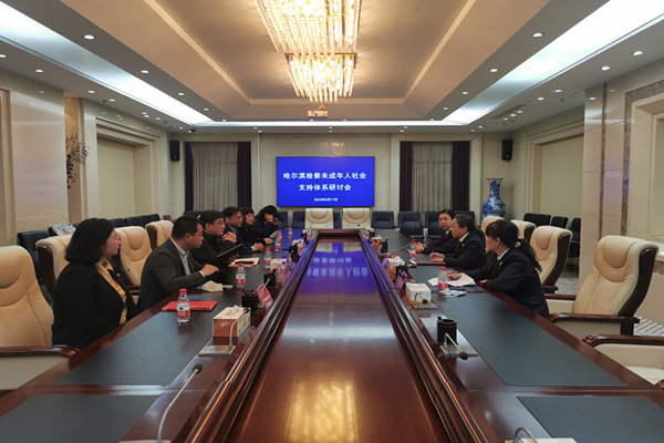 与会全体人员参观了哈尔滨市人民检察院青少年法治教育基地共同参与了未成年人社会支持体系建设研讨会哈尔滨市人民检察院专职委员王春艳对检校合作开展未成年人司法社会工作的愿景发表讲话他表示希望通过双方合作,促进未成年人司法实践与法学、社会学理论研究深度融合,强化未成年人司法保护,完善专业化与社会化相结合的保护体系,共同构建具有我市特色的未成年人社会化支持体系。