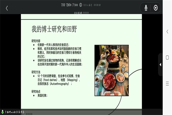 接着,卢婉琳基于在伦敦新一代移民中开展的12个月的田野调查,反思并展望了自我民族志在实践操作中的希望与挑战。例如:自我民族志如何帮助我们更好地理解自我和他者?自我民族志怎样在这种希望和挑战的拉锯中,为人类学研究生成更多角度的对话?怎样为人类学的知识生产提供新的内容?卢婉琳表示,自我民族志作为一种具有批判性的质性研究方法,它不断地引导人们对个体文化中的权利不对称进行反思,以保证在后现代主义思潮下,社会能够持续稳定运转。