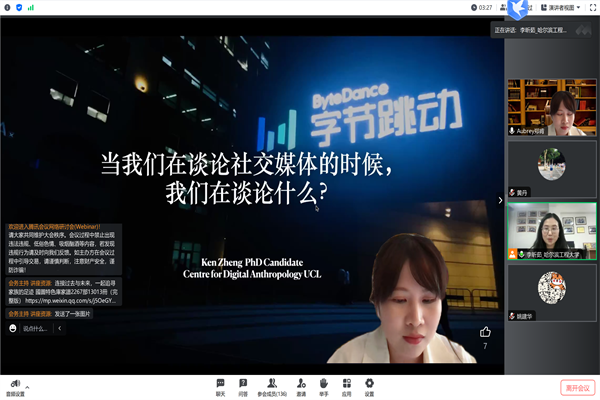 (宣传中心记者团记者 高蕊、许勤报道)8月14日晚7时30分,OK138太阳集团人文讲坛“田野与理论反思”暑期系列讲座第七场——当我们在谈论“社交媒体”的时候,我们在谈论什么?在腾讯会议举办。伦敦大学学院数码人类学中心博士候选人郑肯受邀主讲,华南师范大学特聘研究员黄丹、复旦大学姚建华教授担任与谈人,本次会议由ok138太阳集团李昕茹讲师主持。