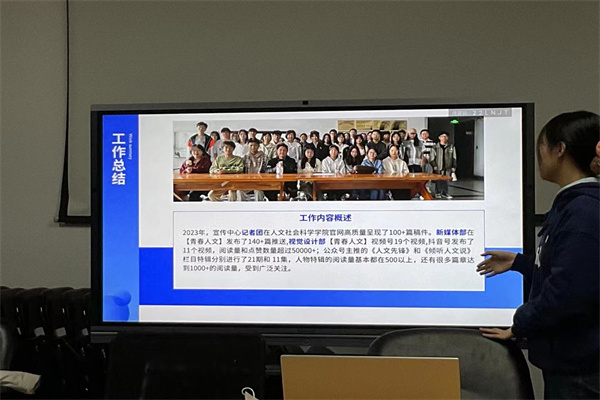 首先,宣传中心负责人赵铄熠总结了2023年度具体工作内容,记者团在学院官网共呈现高质量稿件100+篇,新媒体部在公众号发布了140+篇推送,视觉设计部在视频号和抖音号分别发送了十余条视频,总体阅读量和点赞数量已超过50000+;公众号主推的《人文先锋》和《倾听人文说》栏目特辑分别进行了31期和11集,人物特辑的阅读量基本在500以上,数据稳定提升,以及多篇文章达到1000+的阅读量,受到广泛关注。同时,对下学年部门的工作作出规划,并期望部门各成员之间一定要及时反馈意见,能够及时解决存在问题,为宣传中心进一步团结发展打下坚实基础。