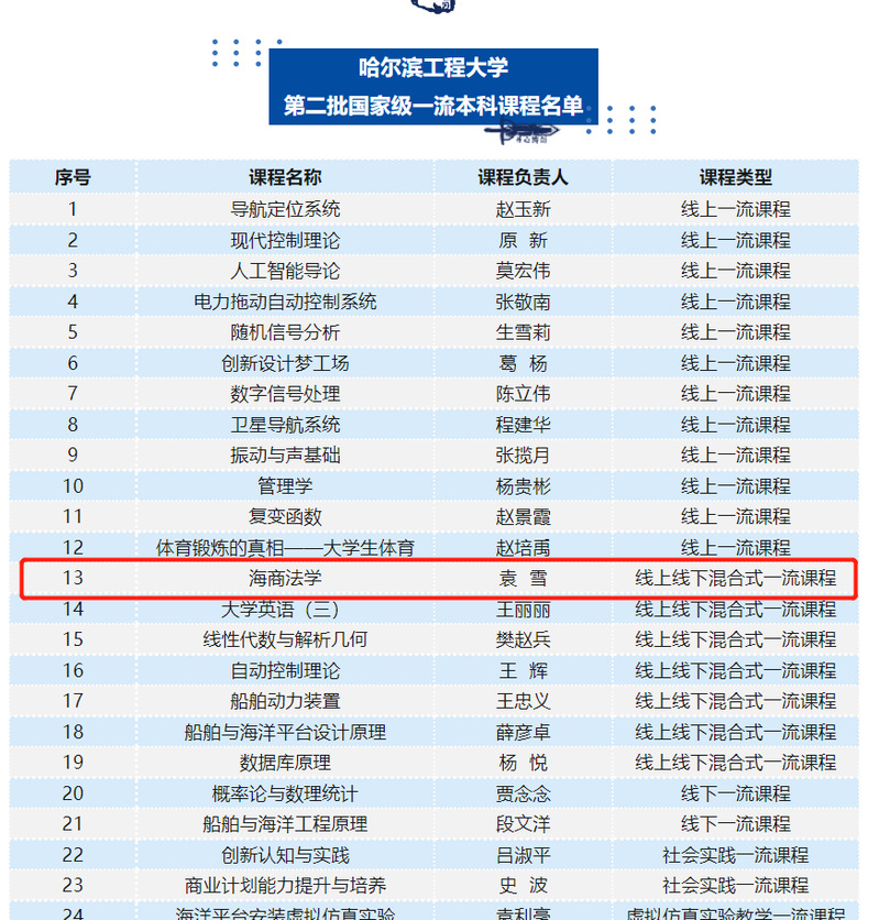 4月11日,根据《教育部关于一流本科课程建设的实施意见》和《教育部办公厅关于开展第二批国家级一流本科课程认定工作的通知》的有关要求,教育部公示了第二批国家级一流本科课程认定结果,我院袁雪老师的《海商法学》喜获国家级线上线下混合式一流课程认定。