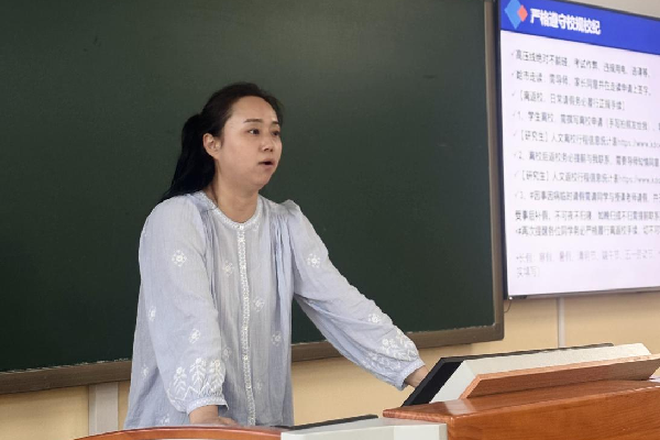 会上,李瑶首先分享了个人及辅导员职责信息,强调了学生安全教育,包括电动车安全使用、宿舍火灾预防等要点。同时她还鼓励有需要的学生及时与教师进行沟通,学校会提供全面的心理健康支持。随后,她重点讲解了《研究生手册》中学生管理相关校规校纪,引导学生务必严格遵守校规校纪,守住安全底线。随后,李瑶还进行了预防诈骗、国家安全、反间谍教育。让同学们进一步了解了身体安全、环境安全、心理安全和国家安全等多个领域的教育活动。