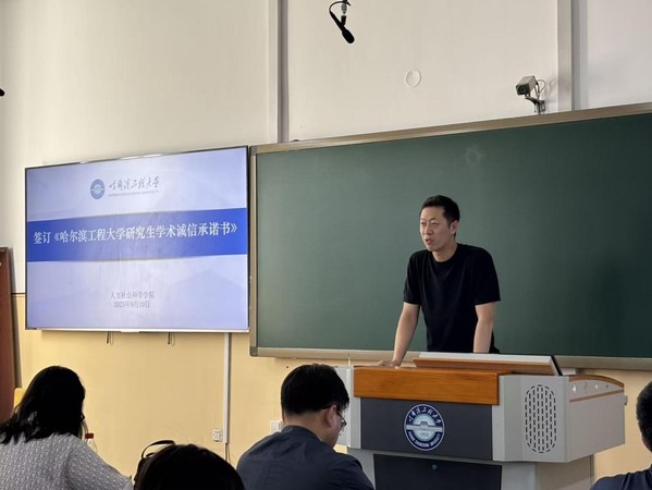 首先,侯博文以“筑牢科研诚信之基 增强创新发展之魂”为主题展开了研究生学术诚信教育。他详细阐述了国家及学校科研诚信相关政策,强调学术道德底线;通过剖析科研失信行为实例,提醒新生严守学术规范,杜绝学术不端。随后,2025级全体研究生现场共同签署了《研究生学术诚信承诺书》。