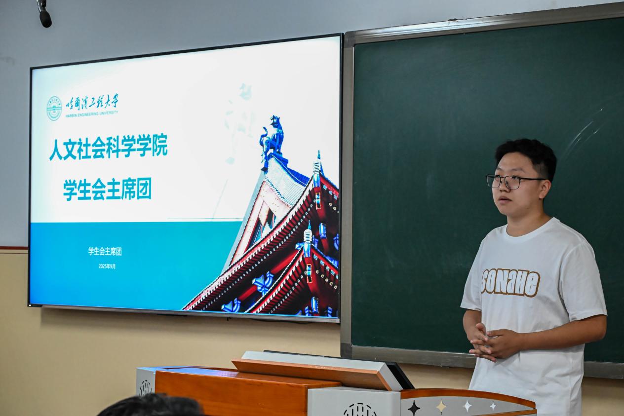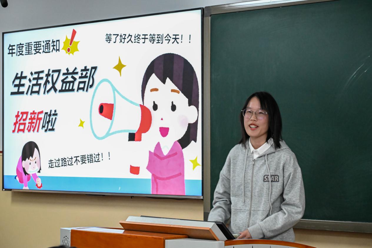 随后进行的是学生会部门的招新宣传。学生会主席姜俊泽同学进行学生会的总体介绍。副主席栾鹤元同学具体展开,介绍学生会各个部门职能特色,说明了学生会在服务同学、促进发展方面的多项举措。其后,双创部、志愿公益部、文体部、学业规划部、学生发展部、生活权益部等六大部门分别进行宣讲。各部门风格鲜明、内容充实,为2025级同学全面了解学生会搭建了清晰完整的认知框架。