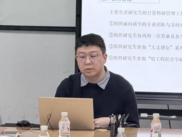 崔彬在总结讲话中充分肯定了本年度研究生辅导员(教师)队伍的辛勤付出与工作业绩。他指出,面对新时代研究生教育高质量发展的要求,辅导员(教师)的角色愈发重要,责任更加重大。崔彬强调,大家要自觉担当起研究生成长的“引路人”、学术规范的“督导员”、心理健康的“呵护者”和学院安全的“预警员”等多重职责,将思想政治工作融入学业指导与科研实践全过程。他希望大家继续秉持人文社科的学科特质,注重培养学生的家国情怀、学术志趣与创新能力,不断优化工作方法,提升育人本领,为学院研究生教育的内涵式发展与高层次创新人才培养贡献更大力量。