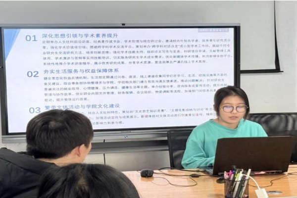 吴静秋主要进行了下学期工作展望。她表示,研究生会将始终秉承“服务同学、助力学术、繁荣文化、促进成长”的宗旨,紧密围绕学院人才培养中心工作。未来将从持续深化思想引领与学术支持、夯实生活服务与权益保障体系、繁荣学院文体活动与文化建设三个维度发力,同时不断加强内部规范管理与部门联动,努力将研究生会建设成同学们“想得起、找得到、靠得住”的温暖家园和坚实后盾。